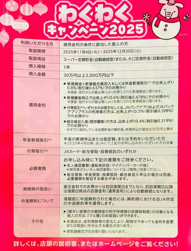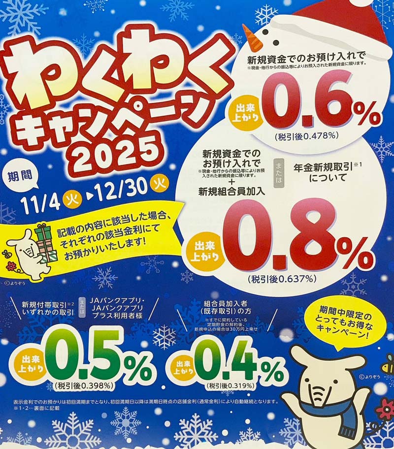 わくわくキャンペーン2025始まりました! 投稿公開日:2025年11月07日(金) 投稿カテゴリー:インフォメーション その他の記事を読む 前の投稿JAバンクアプリプラスによる口座開設の受付停止について 次の投稿不正口座利用防止のためのご協力のお願い