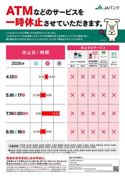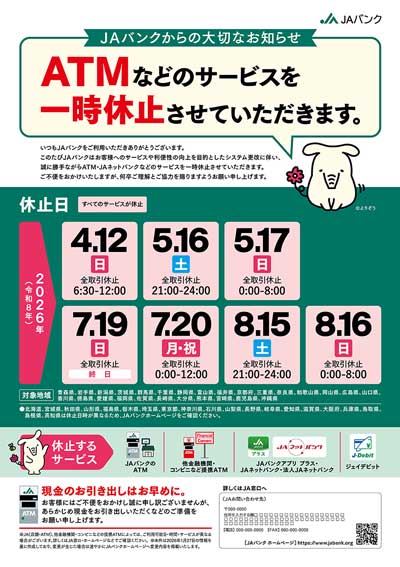 システムメンテナンスに伴うJAネットバンクおよびATMの一時休止について 投稿公開日:2026年3月05日(木) 投稿カテゴリー:インフォメーション システムメンテナンスを下記のとおり実施いたしますので、記載の時間帯についてはJAネットバンクおよびATMが一時的にご利用いただけません。お客様にはご迷惑をお掛けいたしますが、ご理解の程よろしくお願い申しあげます。 都道府県によってサービス休止日が異なりますのでご注意ください。 ATMなどのサービス一時休止の大切なお知らせ(PDF) その他の記事を読む 前の投稿貯金商品概要説明書を公開しました